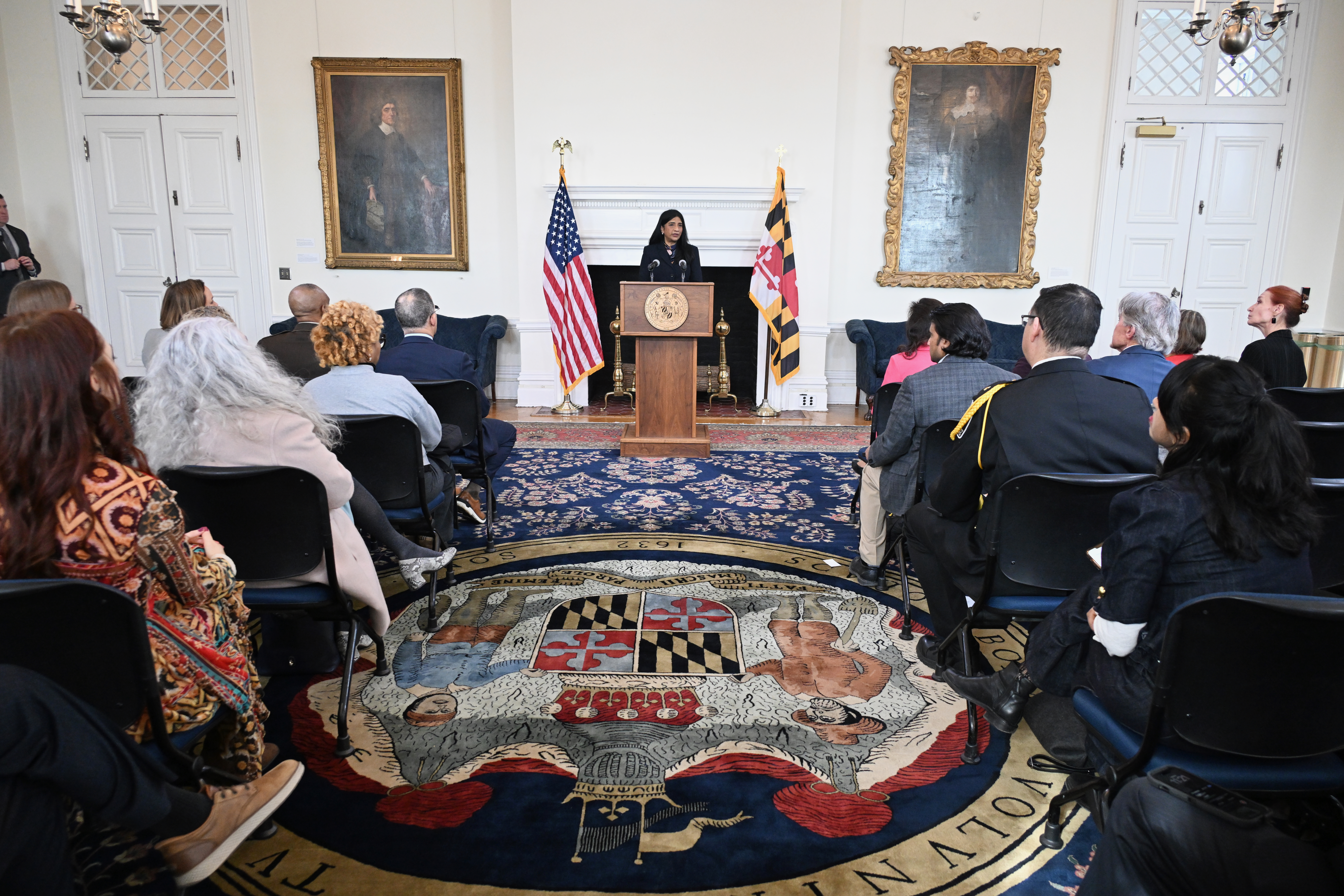 In recognition of National Human Trafficking Prevention Month, Maryland Lt. Governor Aruna Miller, Maryland Secretary of State Susan Lee, and University of Maryland SAFE Center for Human Trafficking Survivors Founder and CEO Susan Esserman led an event at the Maryland State House highlighting Maryland’s commitment to step up to combat human trafficking as the federal government steps back. Lt. Governor Miller and Secretary Lee presented a proclamation signed by Governor Moore recognizing the need for Maryland to step up to fill gaps in services, funding, and law enforcement.